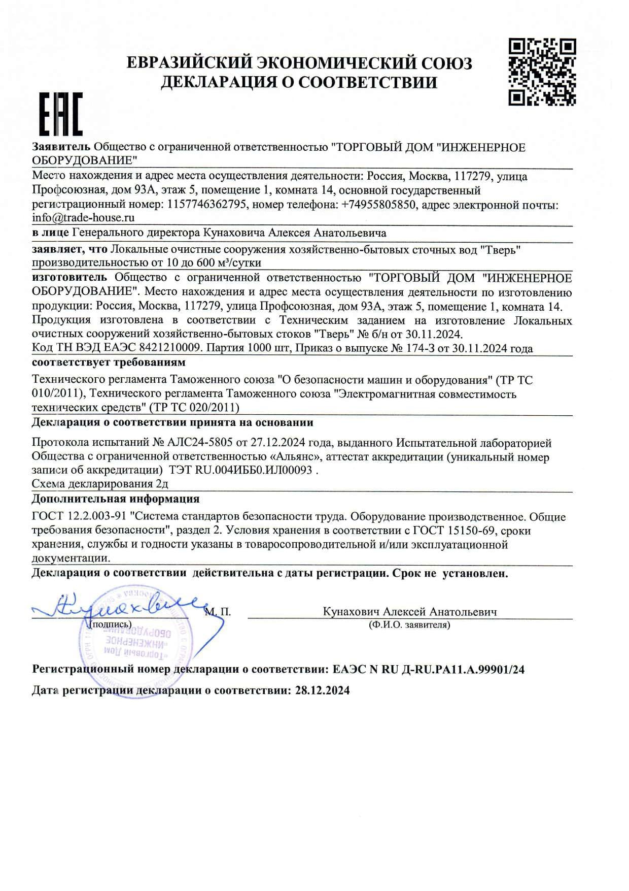 "ТВЕРЬ" - высокоэффективная и надёжная установка очистки бытовых сточных вод. Оборудование предназначено для глубокой механической и биологической очистки, доступен широкий модельный ряд, система подбирается по требованиям заказчика.